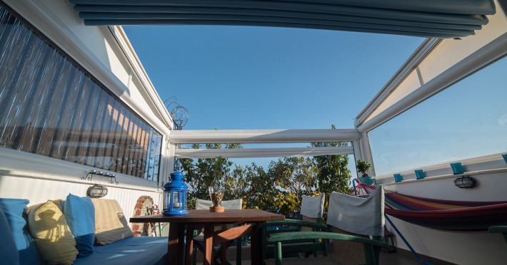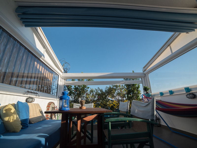 Dandy Villas Nea Kallikratia Sea View Loft is located in Nea Kallikrateia, only 47 kilometers from the city of Thessaloniki. It is an internal maisonette of 50 m2 on the third and fourth floor of a block of flats. The first floor is consisted of a small but fully equipped kitchen with an oven, a sink, a fridge and all the kitchen essentials, a small bathroom with a full toilet set and a shower and a double bedroom with a tv and a small balcony full of plants. Its romantic decoration-with a mosquito net above the bed is combined perfectly with some exotic touches. Upstairs, there is a small living room with a sofa bed,a fireplace and a mini fridge, a bathroom with a full toilet set and a shower, a bedroom with a bunk bed and a beautiful balcony of 20 m2 full of colorful plants and a view to the sea. It contains a big table with chairs, ideal for quiet nights in and an amazing hammock for those who want to enjoy their siesta or admire the night sky outdoors. SURPRISE: The balcony's roof is retractable so you can have a straight view to the sky, PLUS, during winter it can be used as an external living room. Dandy Villas Nea Kallikratia Sea View Loft, although small, is a very compact and cozy apartment. It can host up to 5 people, which makes it suitable for families with children or small groups of friends.
