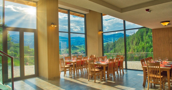 Restaurantul este deservit de o bucatarie utilata profesional si de personal calificat, restaurantul fiind unul cu circuit inchis si se adreseaza doar oaspetilor resortului.