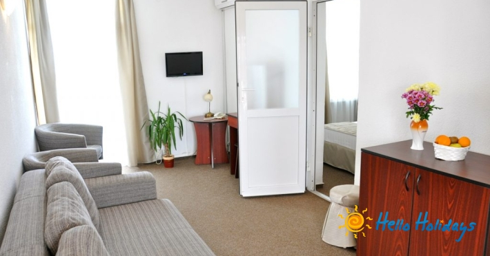 Suita junior situata la etaj, cu balcon, pat matrimonial in dormitor, canapea extensibila in living. Suprafata 30 mp.