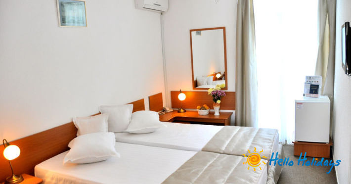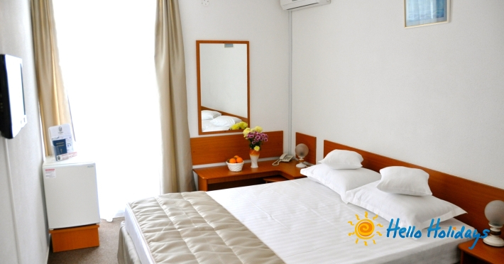 Camera dubla economy are in dotare pat matrimonial, sunt la parter si nu are balcon. Are vedere la piscina si gradina, suprafata 14 mp.