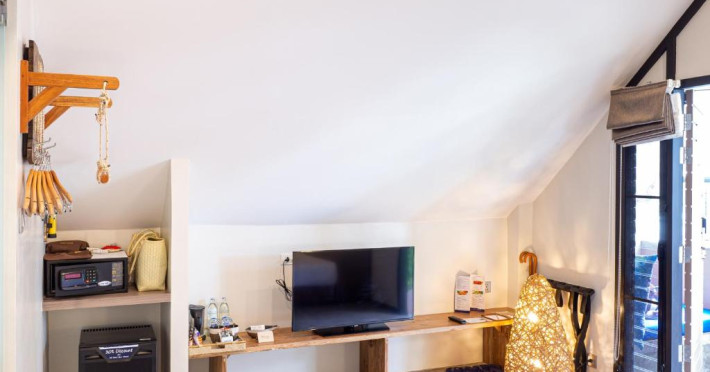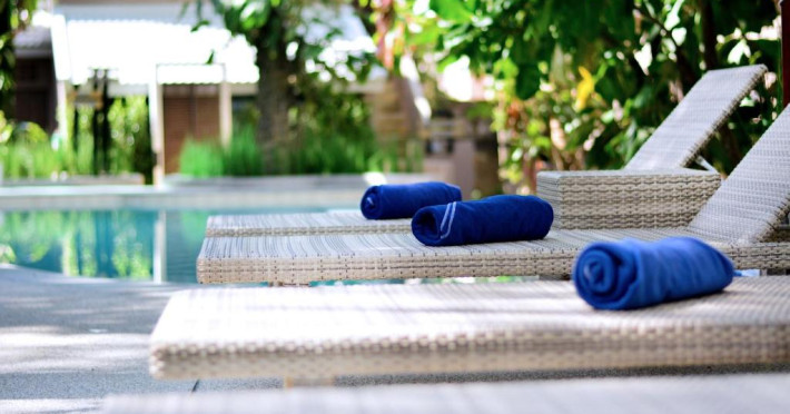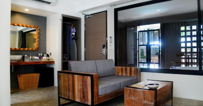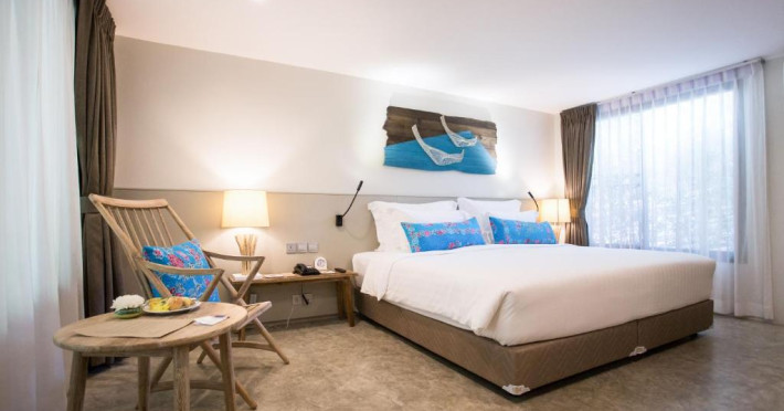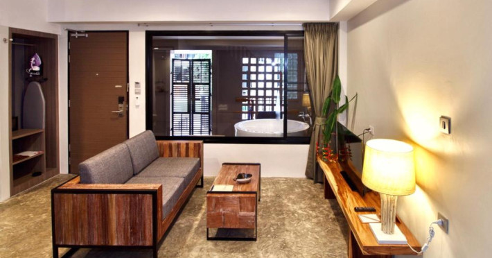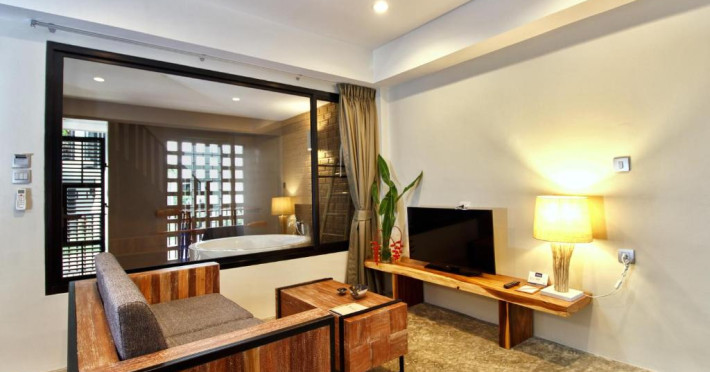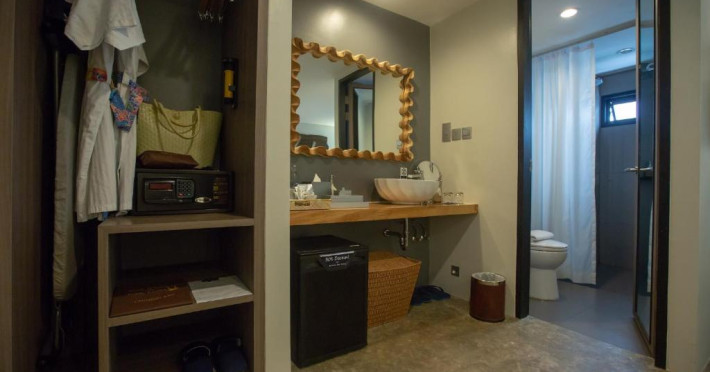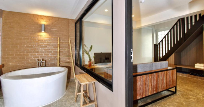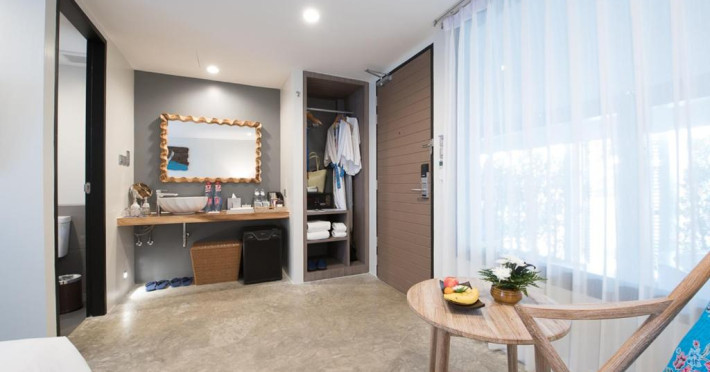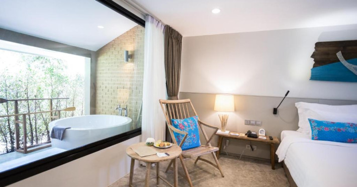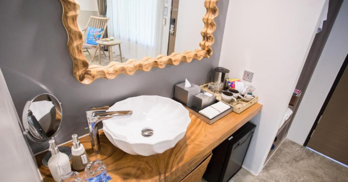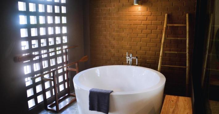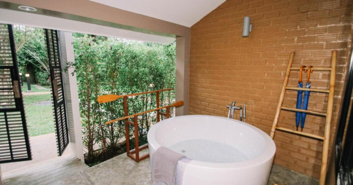 The earth-tone with tints of blue rooms are all air-conditioned and have a privacy balcony that overlooks the garden. The spacious bathrooms are fitted with fluffy towels, bathrobe, complimentary luxury toiletries and a rain shower. Selected room types also come with a separate outdoor bathtub.