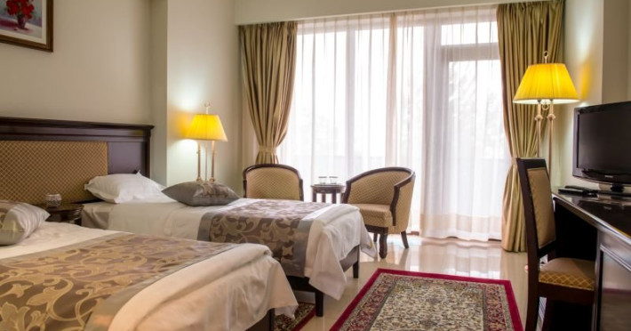 Camera dubla standard - are suprafata de 34 mp, pat queen size, terasa spatioasa (dotata cu masa si scaune), aer conditionat, minibar, seif, baie cu cabina de dus, uscator de par, fierbator, fier cu masa de calcat, doua telefoane, in camera si baie, TV, birou, internet, cosmetice hotel. Capacitatea maxima este de 2 adulti si 2 copii cu varsta cuprinsa intre 0-12 ani neimpliniti, poate fi adaugat un pat suplimentar la cerere.