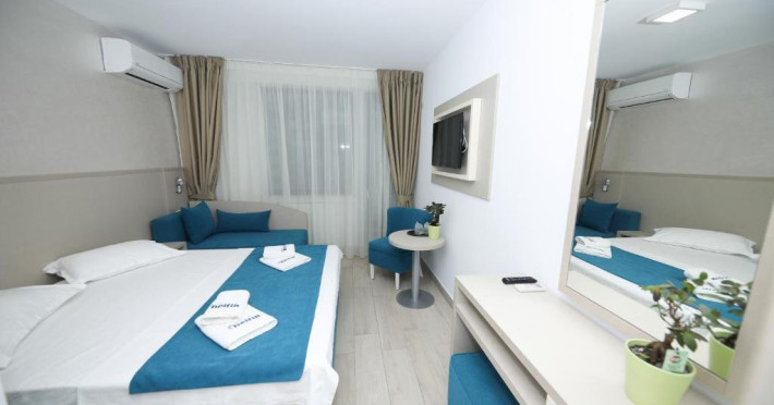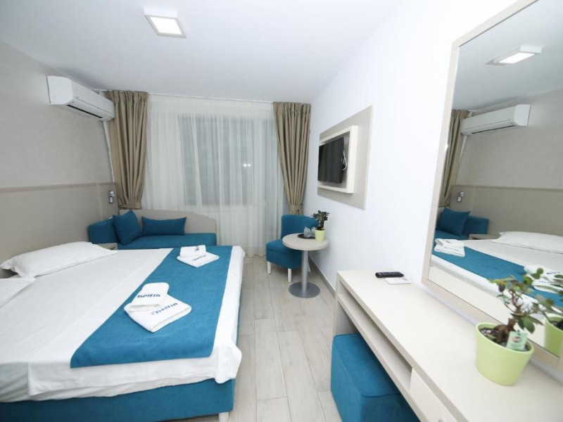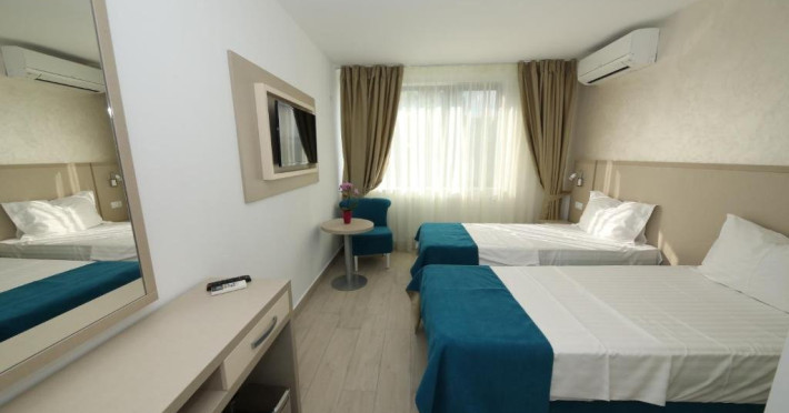 Descriere: Hotel Delfin a fost renovat si reclasificat in anul 2019 si in prezent ofera conditii de cazare specifice clasificarii la 3 stele, camerele fiind dotate cu aer conditionat, bai renovate, televizor si minibar.