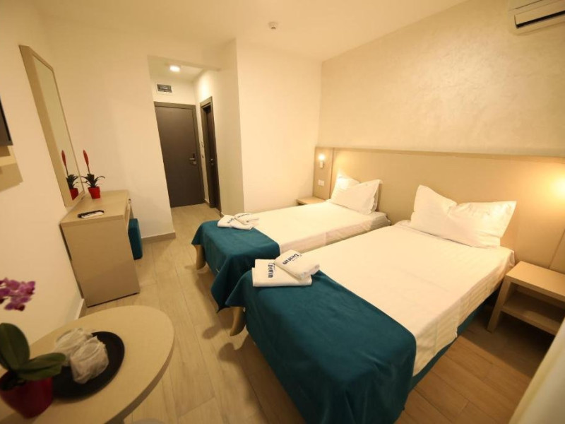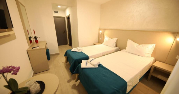 -CAMERA TWIN cu vedere la gradina Camera este spatioasa, cu o suprafata de 18mp si impresioneaza prin imbinarea comfortului cu functionalitatea. Este dotata cu toate facilitatie corespunzatoare pentru o sedere cat mai placuta: aer conditionat, minibar, mobilier de camera compus din doua paturi twin, masa cu doua fotolii si garderoba sau dulap. Televizorul cu ecran plat, internetul wireless si baia privata dotata cu cabina de dus, uscator de par si prosoape, in care articolele de toaleta sunt gratuite, aduc un plus de comfort, toate acestea pentru a va oferi o experienta de cazare cat mai placuta.
