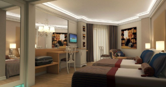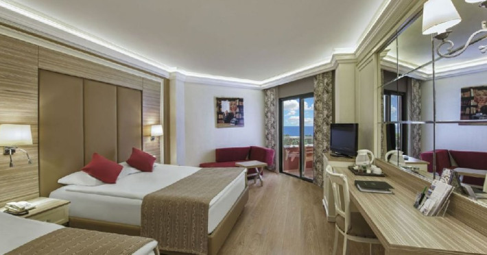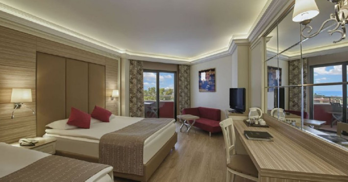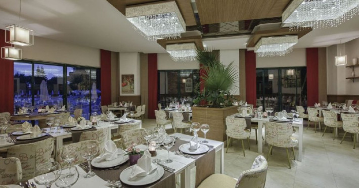 Facilitati hotel: Restaurant principal, sapte restaurante a la carte, zece baruri, cafenea, patiserie, trei piscine exterioare, piscina pentru copii, doua piscine cu tobogane, piscina interioara pentru adulti si copii, jocuri la piscina, programe de animatie, muzica live in anumite seri, discoteca, camera de jocuri, internet cafe, baie turceasca, sauna, camera cu aburi, jacuzzi, salon de cosmetica,doua terenuri de tenis (cu rezervare), nocturna (cu rezervare), lectii de tenis, tenis de masa, dart, volei pe plaja, centru fitness, biliard, bowling, aerobic, gimnastica, step, internet wi-fi in camere si in lobby.