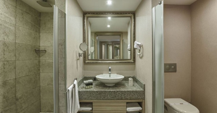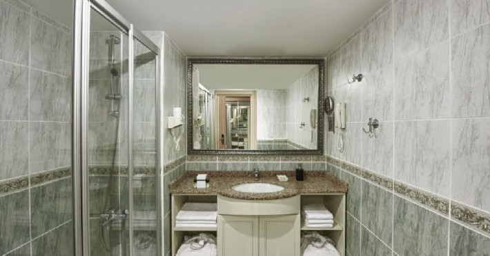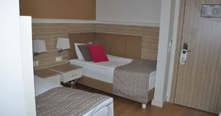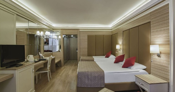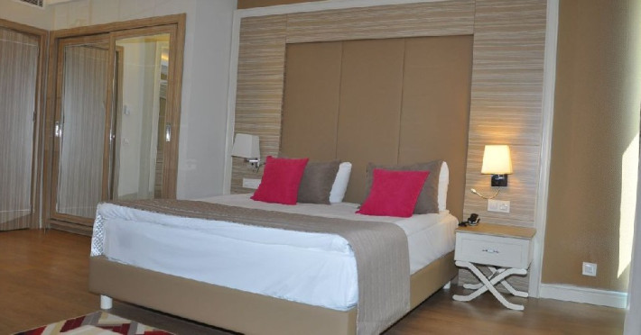 Facilitati camere: Hotelul este format dintr-o cladire de 6 etaje (80% din camere au vedere la mare directa sau partiala) avand 408 camere standard (max. 2+2 persoane, 27 mp) si 8 camere conectate (2 camere standard, conectate printr-o usa, 2 bai, max. 4 persoane, 54 mp). Camerele hotelului sunt dotate cu baie, aer conditionat centralizat, televizor,telefon, minibar (bauturile racoritoare, berea, alunele si ciocolata se suplimenteaza zilnic - gratuit), seif (gratuit), balcon si room service (00:00-06:00, gratuit).