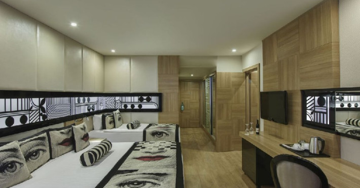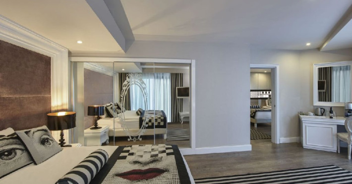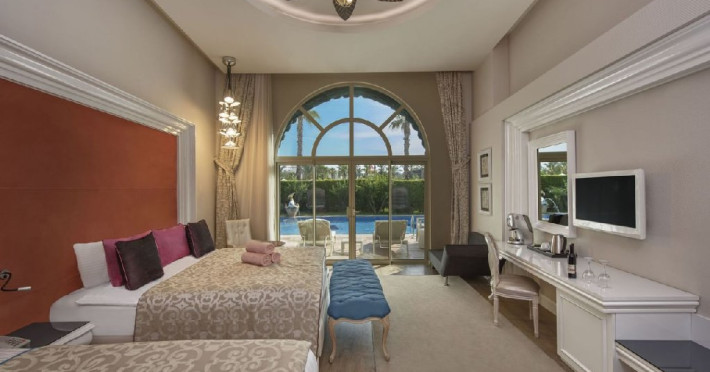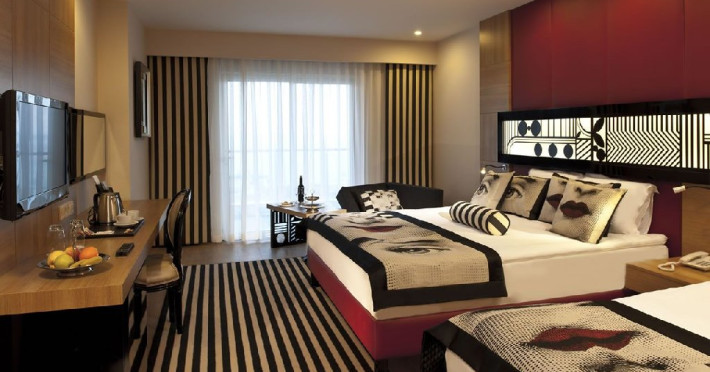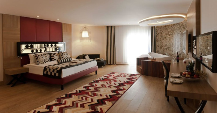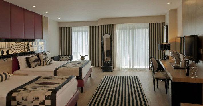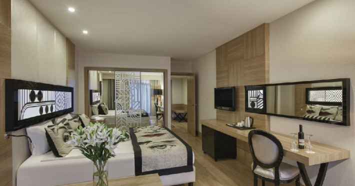 Facilitati camera: Hotelul dispune de 650 de camere, din care: 474 camere superior, 8 camere pentru persoanele cu dizabilitati, 38 camere family, 43 de camera conectate, 64 de camera junior suite, 21 camere lagoon, 2 suite. 9 camere deluxe family. Toate camerele sunt dotate cu balcon, baie proprie cu cada sau cabina de dus, uscator de par, sistem centralizat de aer conditionat cu program in functie de conditiile meteorologice, telefon direct, seif, mini bar (apa, bauturi racoritoare, bere, nuci si ciocolata realimentat zilnic), ceainic, set cafea ceai, internet wireless, TV prin satelit si canale de muzica.