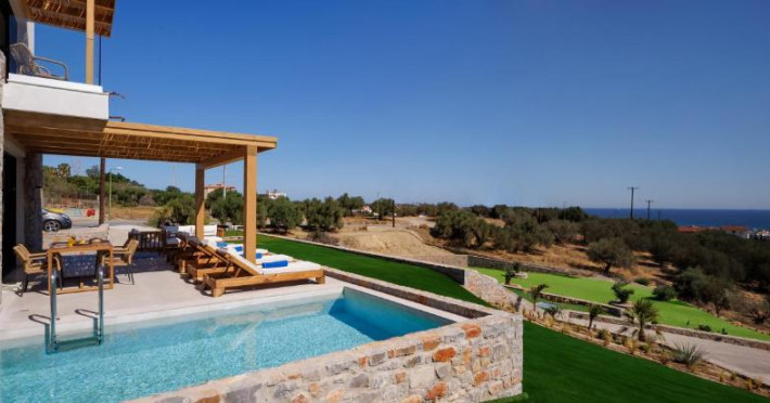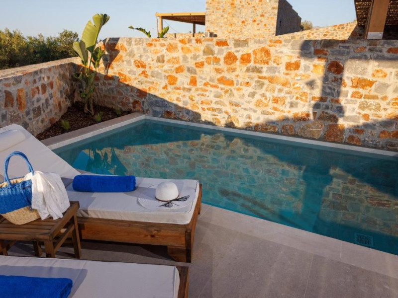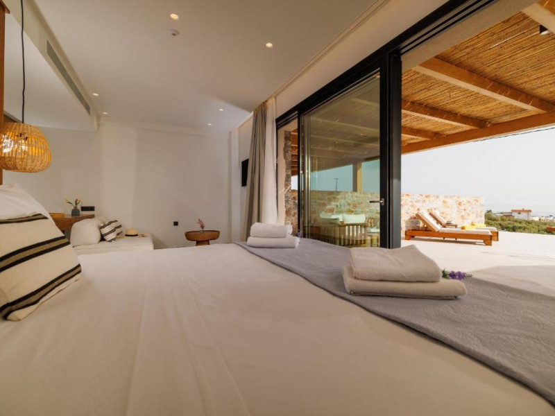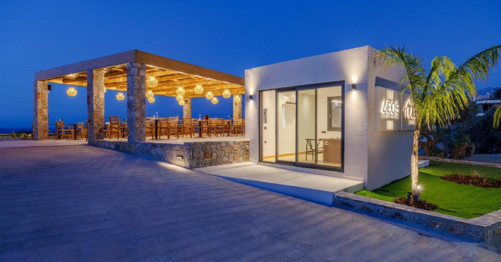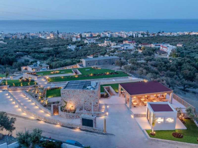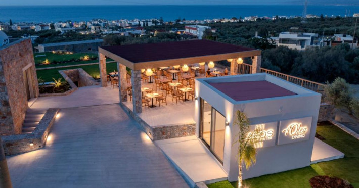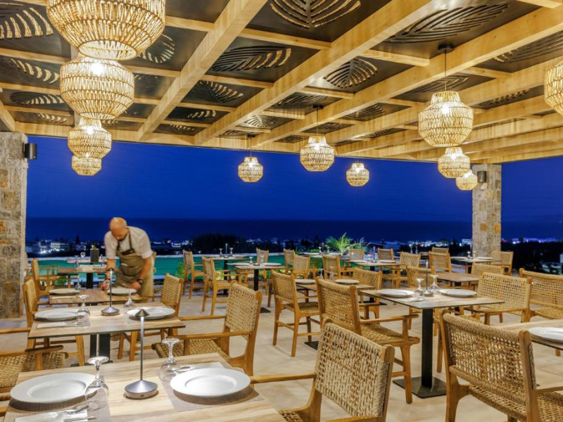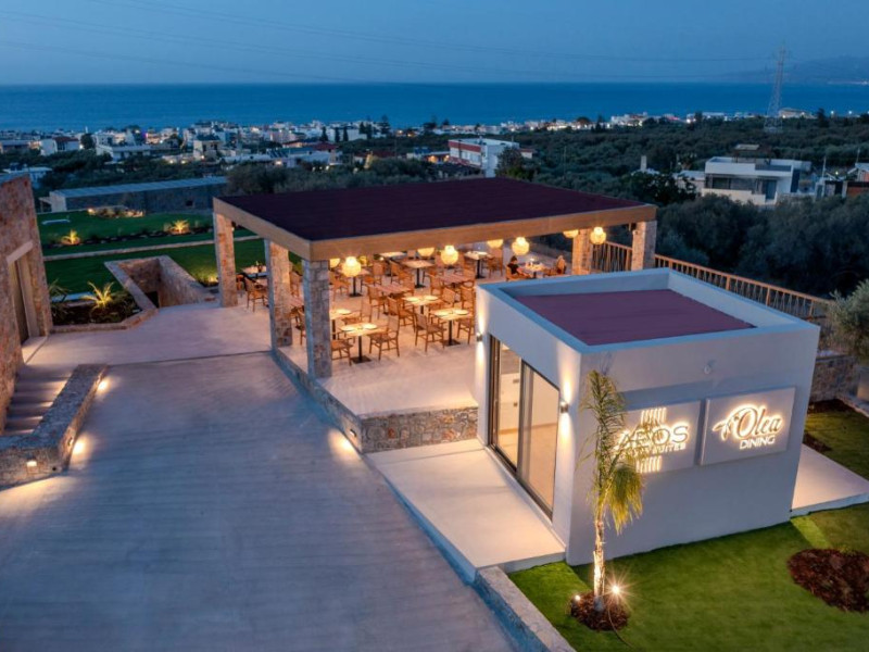 Oaspeții se pot relaxa la piscina infinity cu șezlonguri și umbrele, sau pot savura cocktailuri rafinate la barul de la piscină. Restaurantul hotelului servește specialități mediteraneene autentice, cu accent pe bucătăria cretană.