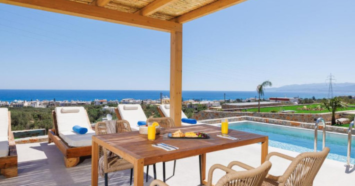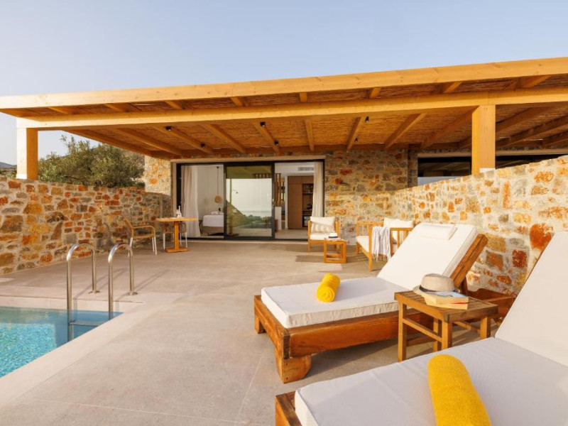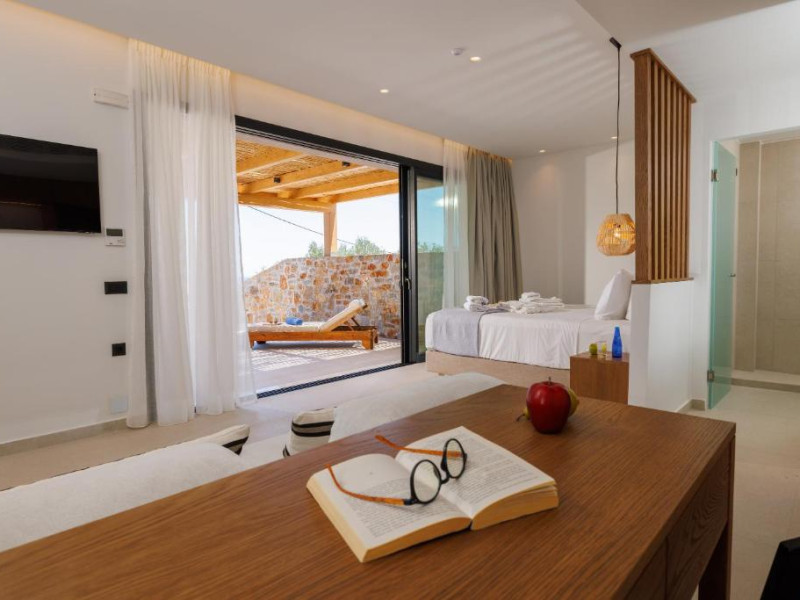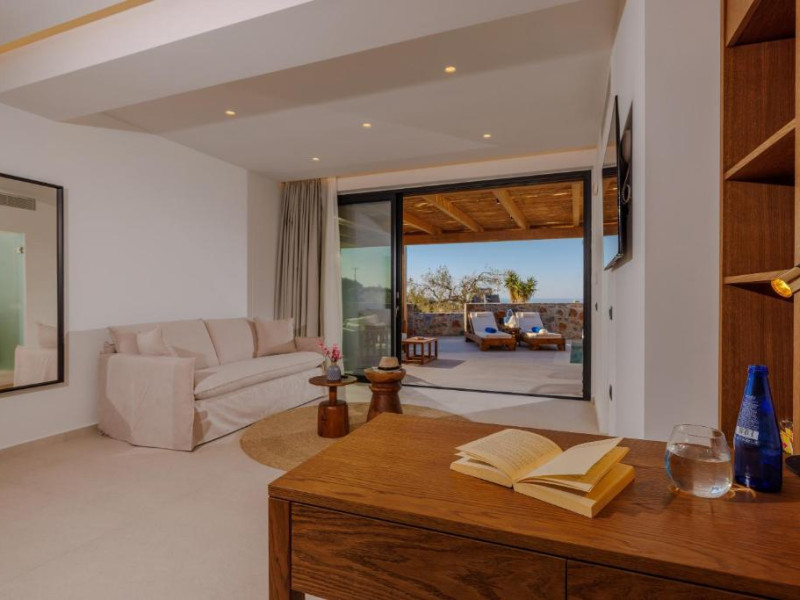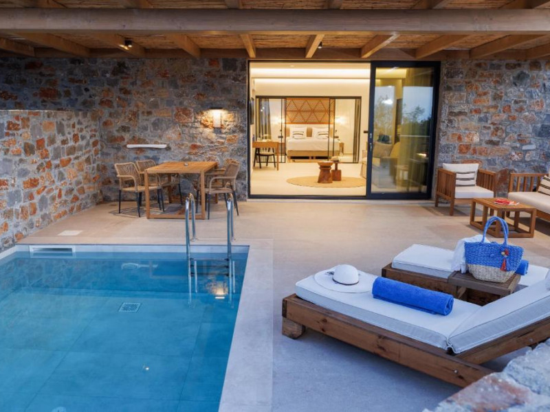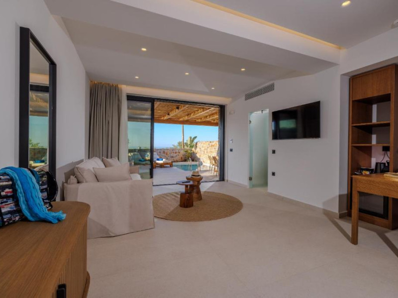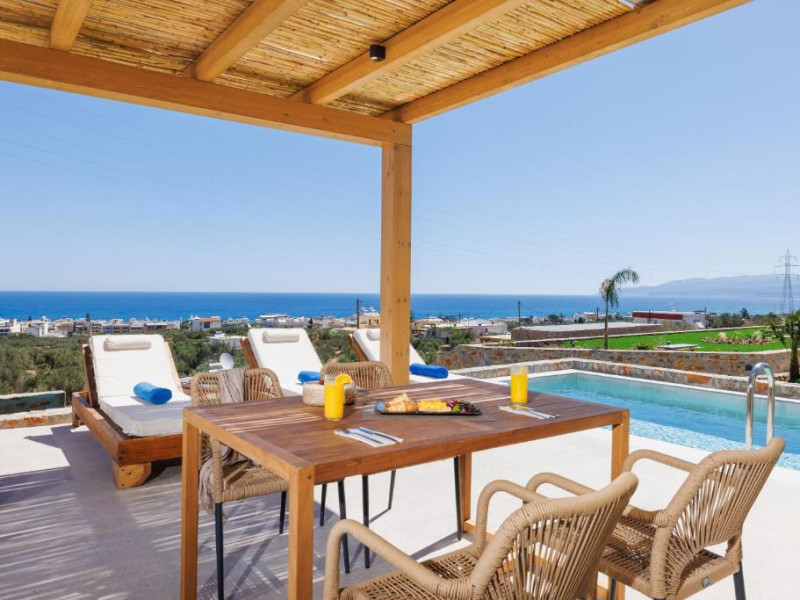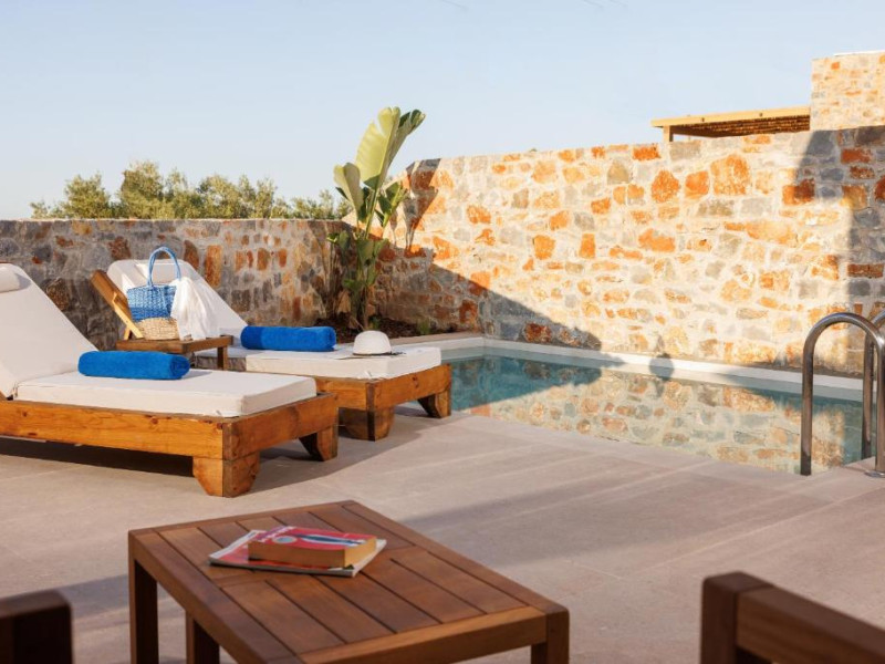 Oaspeții se pot relaxa la piscina infinity cu șezlonguri și umbrele, sau pot savura cocktailuri rafinate la barul de la piscină. Restaurantul hotelului servește specialități mediteraneene autentice, cu accent pe bucătăria cretană.