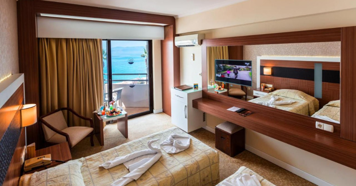 Localizare: Hotelul este situat în apropiere de Plaja Kusadası Sahil și la 35 km de Aeroportul Internaţional Samos. Facilități hotel: 2 piscine, acces imediat la plajă, camere de familie, WiFi gratuit inclus, transfer de la și/sau la aeroport, spa și centru de wellness, parcare gratuită, sală de fitness, bar, zonă de plajă privată. Dotări camere: balcon, vedere la grădină, aer condiționat, baie privată, TV cu ecran plat, terasă, Minibar. Servicii contra cost: serviciu de transfer, serviciu de curățătorie și călcătorie, snorkelling, scufundări, facilități sporturi nautice, pescuit, echipament tenis, biliard, masaj, sală fitness, spa și centru wellness, saună, jacuzzi. IMPORTANT: Descrierea hotelului se bazează pe detaliile disponibile la momentul pregătirii tarifelor pentru sezonul turistic ce urmează a se desfășura și are caracter pur informativ. Hotelul poate aduce modificări de structură, denumiri camere, tip servicii incluse/neincluse și altele, fără a notifica în prealabil. Pentru informațiile oficiale vă rugăm să consultați website-ul hotelului.Datorita dinamicitatii domeniului disponibilitatea ofertelor se modifica de la un moment la altul. De aceea ofertele sunt valabile in limita locurilor disponibile. Agentia nu este responsabila pentru eventualele neconcordante care pot aparea intre informatiile privind tarifele si alte detalii din site si informatiile primite in agentie. In aceste cazuri vor avea prioritate, intotdeauna, informatiile primite in agentie.