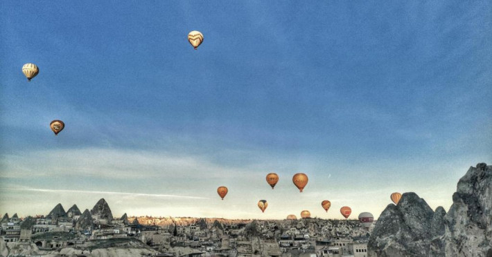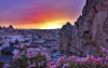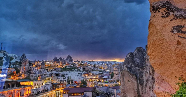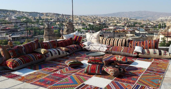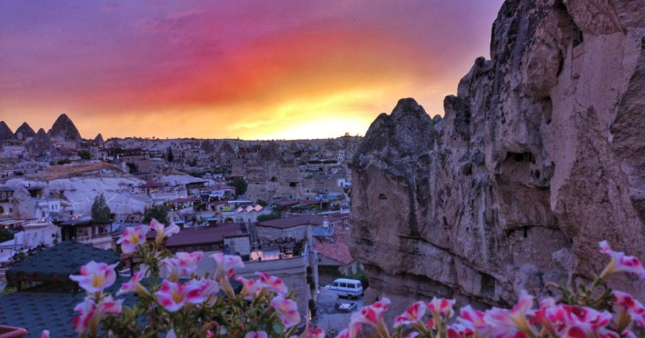 După o zi de excursii, terasa de pe acoperis este un loc plăcut pentru a admira soarele care apune deasupra peisajului stancos din jurul orasului Goreme.