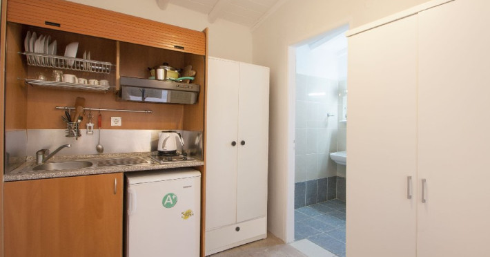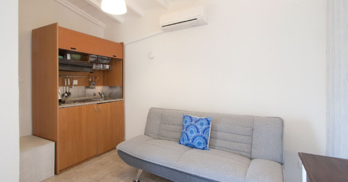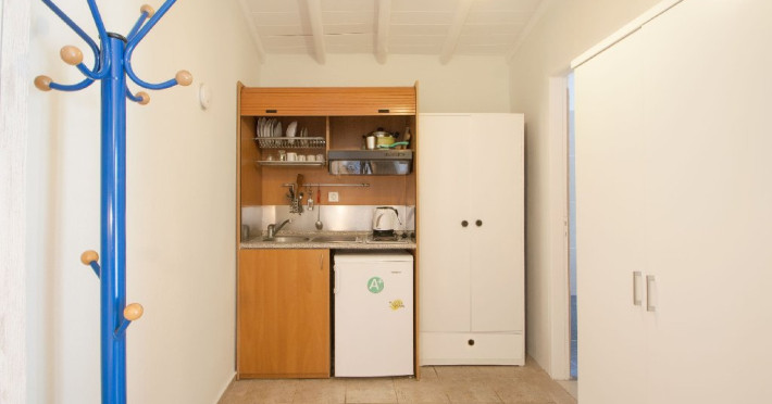 Facilitati camere: Studio-urile vilei sunt luminoase si spatioase, echipate cu aer conditionat (contra cost la fata locului, pentru care se plateste optional la proprietar 35 euro pe camera/ saptamana), cu terasa, baie cu dus si chicineta dotata cu plita electrica, frigider, fierbator apa, hota si vesela.