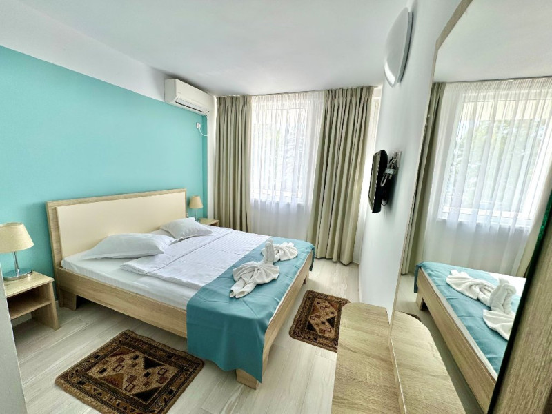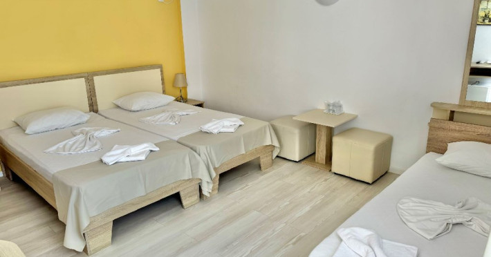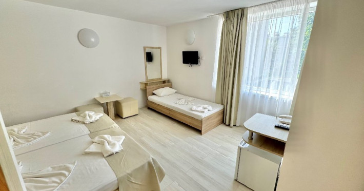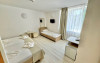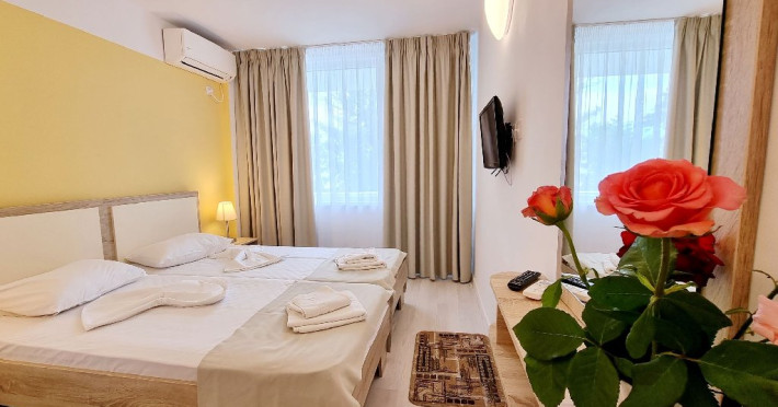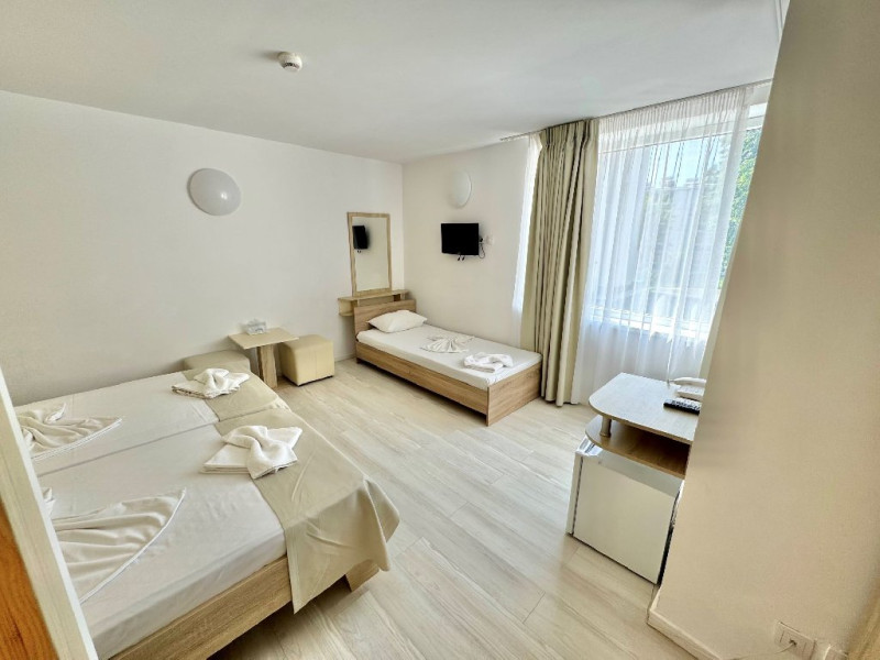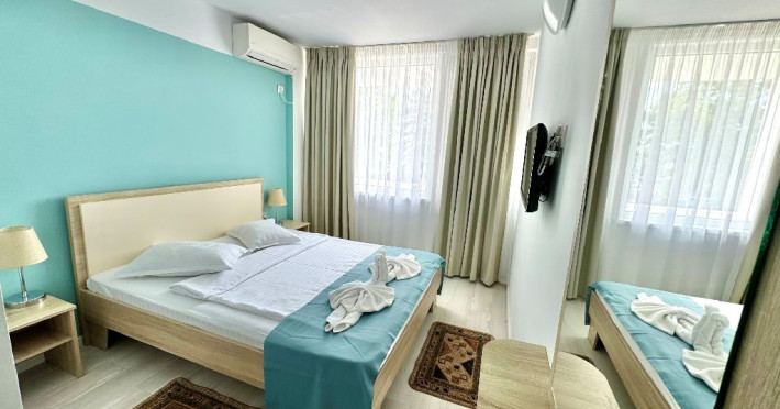 Camera dubla family dispune de 2 paturi, unul matrimonial si unul single, baie cu dus, aer conditionat, TV, minibar, telefon.