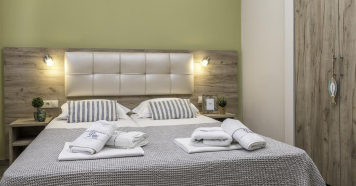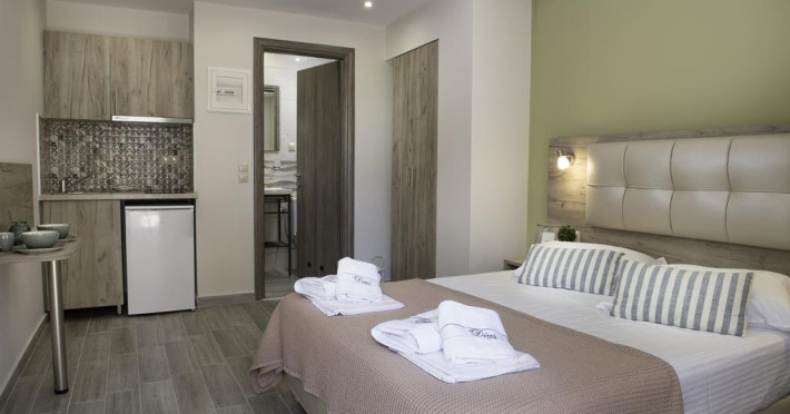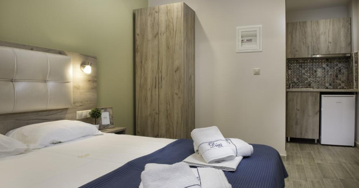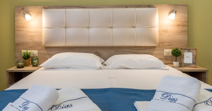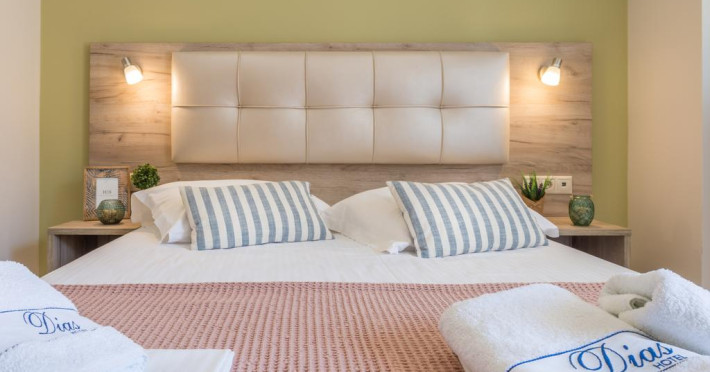 Sunt disponibile 30 camere. În camere există baie cu duș. Unele camere au balcon cu vedere la mare, unde oaspeții pot admira apusul sau răsăritul soarelui. Camerele de la Dias au în dotare aer condiționat și Tv. Fiecare cameră dispune de minibar. Oaspeții au acces gratuit la serviciul Wi-fi în camere. Fiecare unitate de cazare are frigider. Proprietatea oferă camere pentru familie cu o suprafață mai mare și un număr mai mare de paturi față de cele standard.