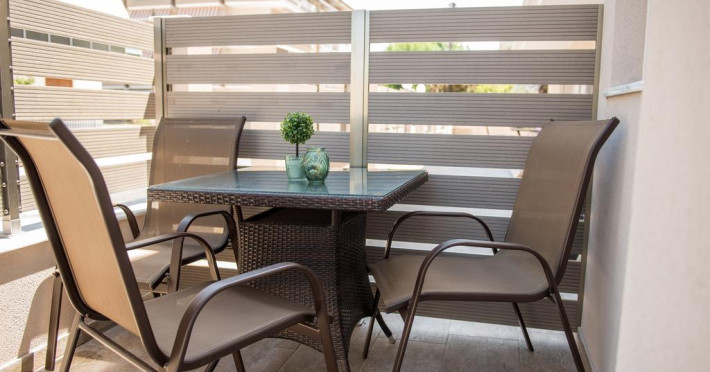Dias are în apropiere o plajă cu pietriș. Pe plajă există șezlonguri și umbrele de plajă contra cost.