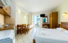 All rooms consist of A/C, Bath/Shower, Hairdryer, Kitchen facilities, Fridge, Safety box (with charge), Telephone, Radio, Satellite TV, Balcony/Terrace, with sea view, pool view or garden view.