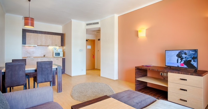 Toate camerele dispun de aer conditionat centralizat, televizor cu programe prin cablu, telefon, mini bar, facilitati de preparare a cafelei/ceaiului, seif, Wi-Fi gratuit, canapea, baie cu dus sau cada, uscator de par, produse de toaleta gratuite, balcon. De la receptie se ofera, la cerere, fier de calcat si masa de calcat. Apartamentele dispun, in plus fata de camerele duble, de zona de living cu canapea extensibila si chicineta complet echipata.
