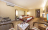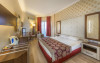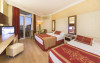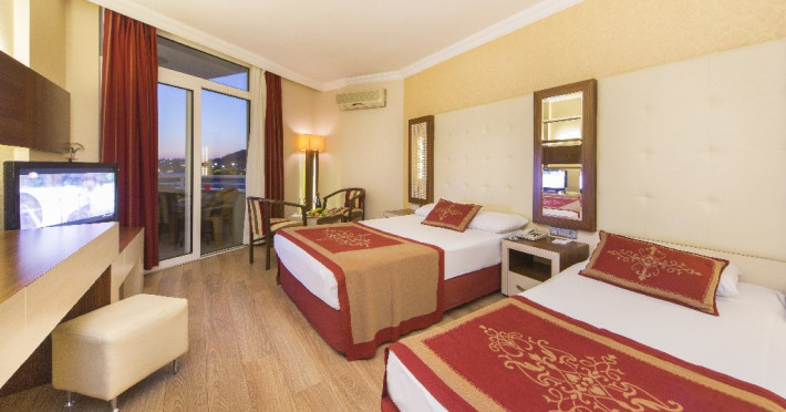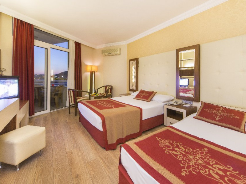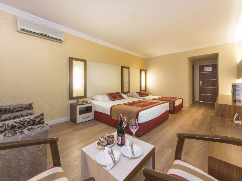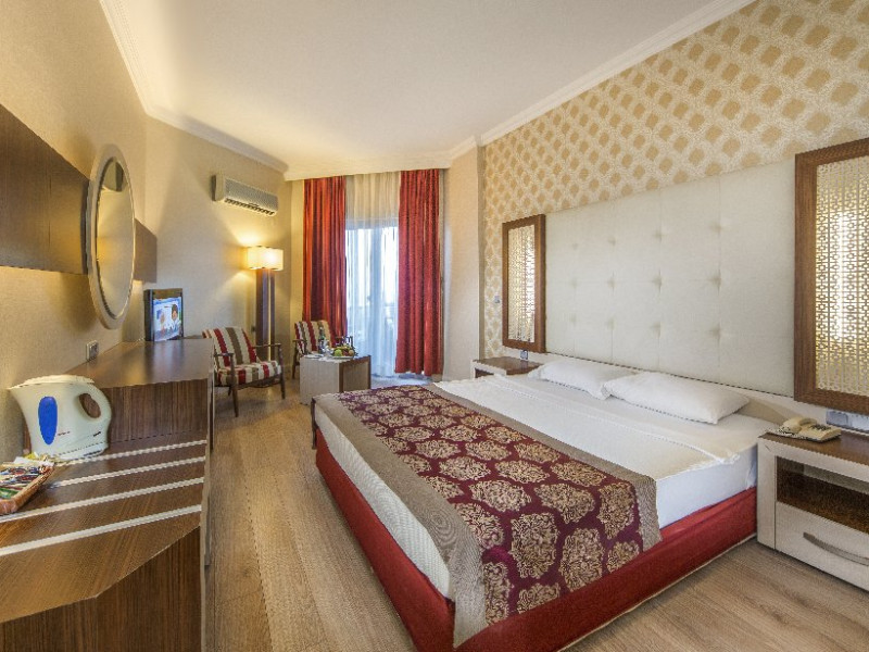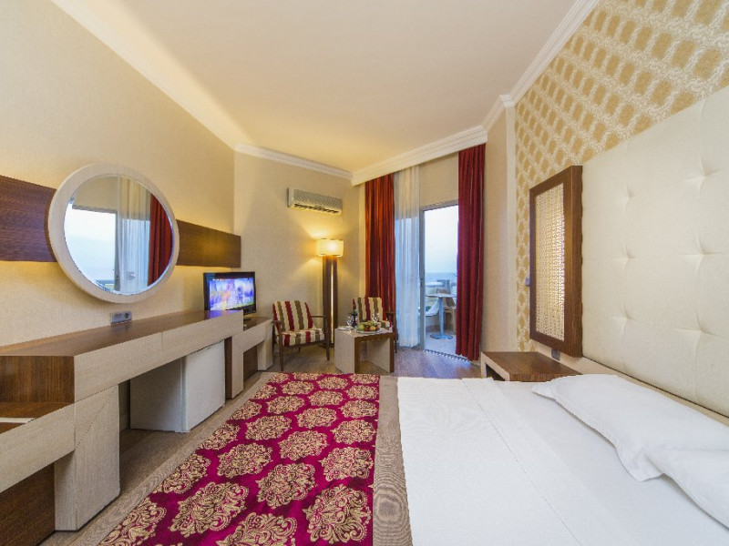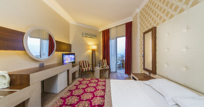 Facilitati camere: Hotelul are 2 cladiri cu 6 nivele (60% dintre camere au vedere partiala sau directa la mare) cu un numar total de 391 camere, dintre care 349 camere standard deluxe (24 -26 mp), 37 camere family deluxe (40 mp), si 5 camere pentru turistii cu dizabilitati (25 mp). Toate camerele sunt dotate cu: baie, telefon, tv, minibar, aer conditionat, balcon, uscator de par, fierbator, seif, podea laminata.