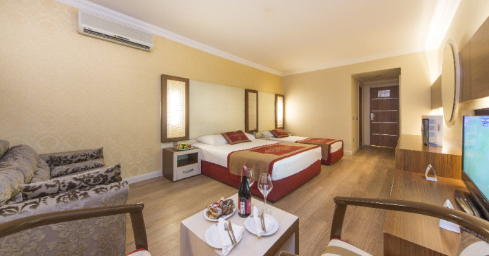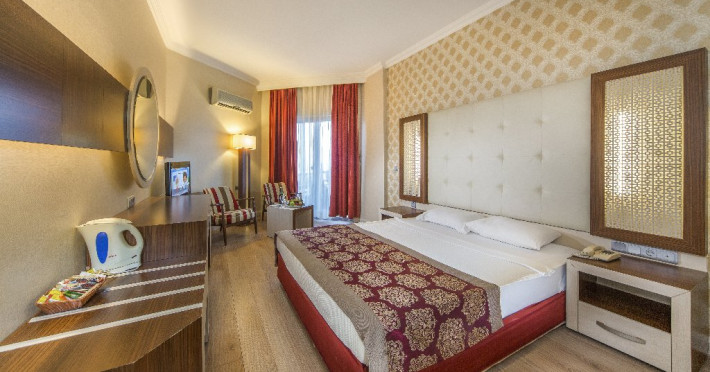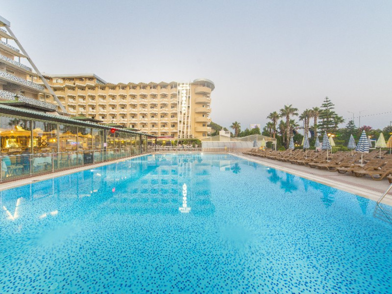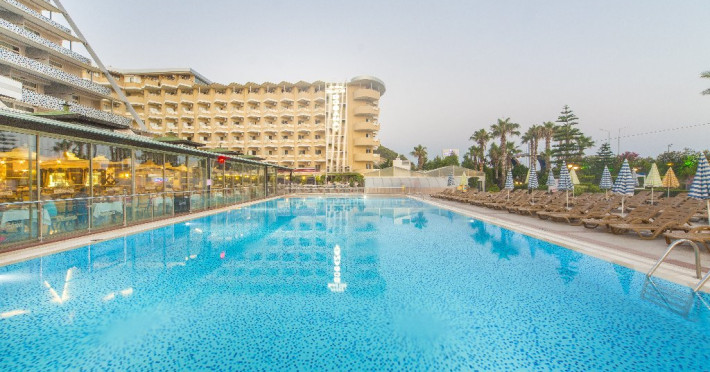 Facilitati hotel: Hotelul dispune de: un restaurant principal, 4 restaurante a la carte unde turistii pot merge o singura data pe saptamana pe sejur de 7 zile si este nevoie de o rezervare in avans si doua restaurante a la carte unde este perceputa o taxa suplimentara, 6 baruri, 2 piscine exterioare, o piscina interioara, 3 topogane, cabinet medical, coafor, lant de magazine, spalatorie, 5 sali de conferinte (max 35-100 persoane), internet WIFI pe intreg teritoriul hotelului.