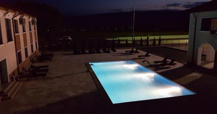 Curtea interioara cu piscina iluminata, cat si imprejurimile resort-ului au fost gandite astfel incat sa fie in armonie cu viile ce inconjoara complexul.