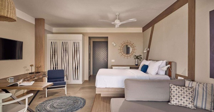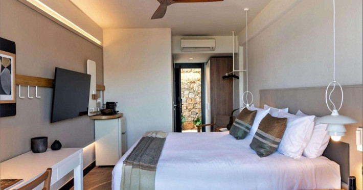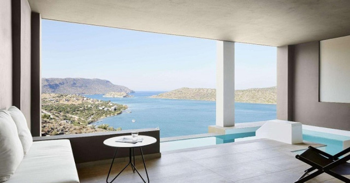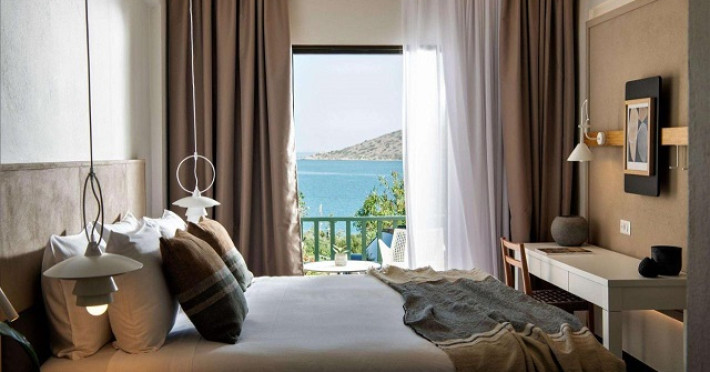 Camere spatioase, mobilate elegant, ofera vedere panoramica la Marea Mediterana si la insula Spinalonga. Dotari camere: oglinda pentru machiaj, TV cu ecran plat de 55”, uscator de par, A/C individual, fier/masa de calcat, seif electronic, facilitati pentru prepararea ceaiului si a cafelei, Wi-Fi, telefon cu apel direct, baie cu dus walk-in, balcon sau terasa, halate de baie si papuci de baie.