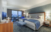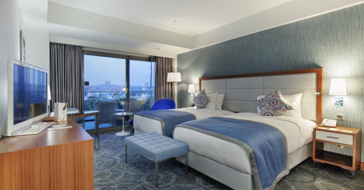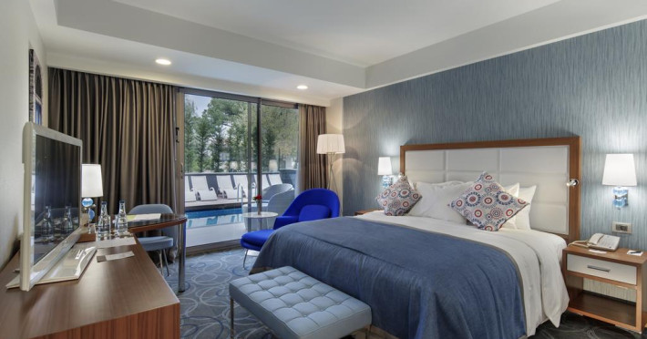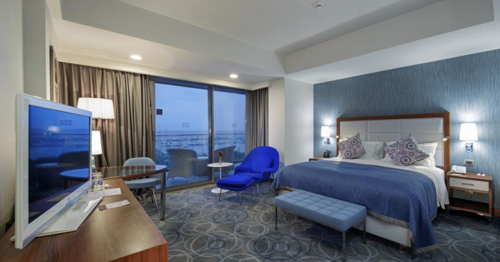 Sunt disponibile 87 camere. Camerele luminoase de la Doubletree By Hilton Kusadasi sunt dotate cu mochetă, aer condiționat, Tv cu canale prin satelit și seif. Fiecare cameră dispune de minibar și cană-fierbător. Oaspeții pot solicita serviciul de room service pentru a servi masa sau diverse băuturi. Camerele au balcon cu vedere la mare sau la grădină. În camere există baie cu cadă sau duș ce are în dotare foehn și articole de toaletă gratuite. Oaspeții au acces gratuit la serviciul Wi-fi în camere. Curățenia in cameră se face zilnic. Proprietatea oferă camere pentru nefumători.