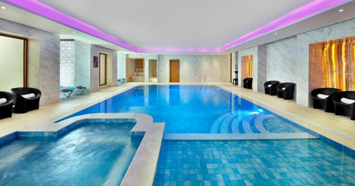 Din facilitățile oferite de proprietate nu lipsește centrul de wellnes și spa, unde oaspeții pot încerca diferite tratamente de înfrumusețare sau se pot relaxa la masaj sau la saună. Doubletree By Hilton Resort & Spa Marjan Island are în dotare jacuzzi. Pentru cei interesați proprietatea oferă servicii de înfrumusețare și o întreagă gamă de tratamente corporale. În cadrul proprietatății există piscină interioară și 5 piscine în aer liber pentru cei care doresc să se relaxeze și să se bronzeze. Acestea sunt prevăzute cu șezlonguri confortabile, prosoape și umbrele de soare, precum și cu bar, unde oaspeții pot degusta băuturi alcoolice sau răcoritoare. Doubletree By Hilton Resort & Spa Marjan Island dispune de aqua park, ceea ce oferă un plus de amuzament copiilor, dar și adulților.