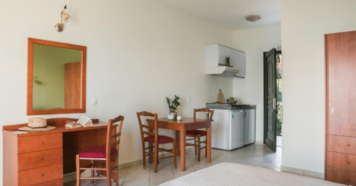 Camerele confortabile de la Eagle's Nest Studios sunt dotate cu pardoseală de gresie/ marmură, aer condiționat și seif. Fiecare cameră dispune de cană-fierbător. Camerele au balcon cu vedere la mare sau la munte. În camere există baie cu cadă sau duș prevăzută cu foehn. Oaspeții au acces gratuit la serviciul Wi-fi în camere. Există unități de cazare care au chicinetă utilată cu frigider și plită de gătit.