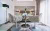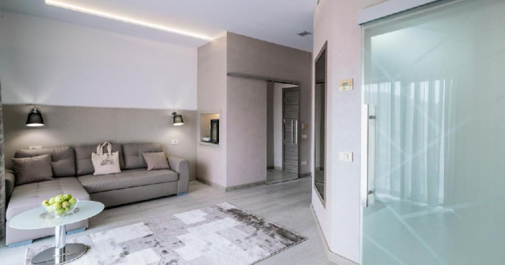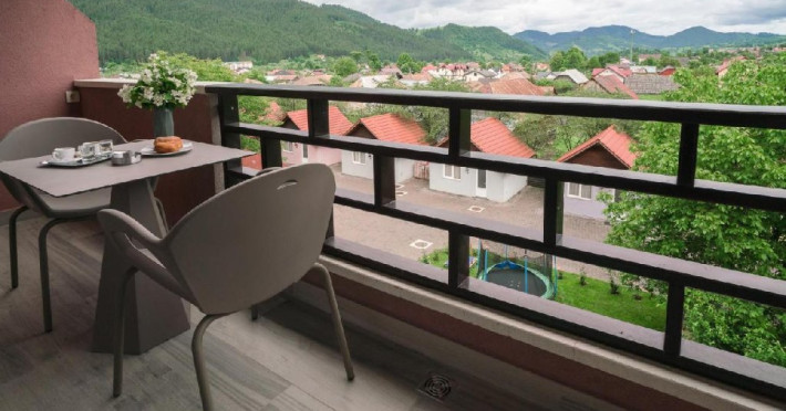 Apartament 4* superior cu balcon - 3 apartamente, 50 mp, 2 camere (living si dormitor) etaj 2,3,4. Apartamentele sunt echipate cu dressing, baie cu cada (dua), WC, bideu, minibar, cafetiera, TV Led 108-140 cm, televiziune digitala 200 canale, internet de mare viteza, control acces, climatizare si iluminat inteligent. Camerele sunt dotate cu pat 180x200 cm si canapea extensibila, saltea ergonomica 30 cm, perne antialergice, lenjerie premium, halate de baie, pardoseala parchet ecologic, balcon S-E 18 mp cu vedere panoramica spre Masivul Rarau.