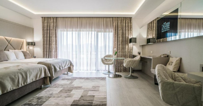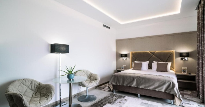 Camera dubla 4* superior - 8 camere, 32 mp, etaj 2,3. Camerele sunt echipate cu dressing, baie cu dus, WC, minibar, cafetiera, TV Led 108 cm, televiziune digitala 200 canale, internet de mare viteza, control acces, climatizare si iluminat inteligent. Camerele sunt dotate cu pat 180x200 cm , saltea ergonomica 30 cm, perne antialergice, lenjerie premium, halate de baie, pardoseala parchet ecologic. Camerele au vedere spre munte S-V.