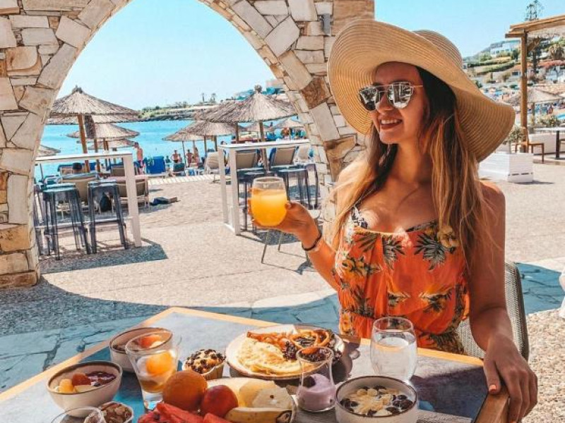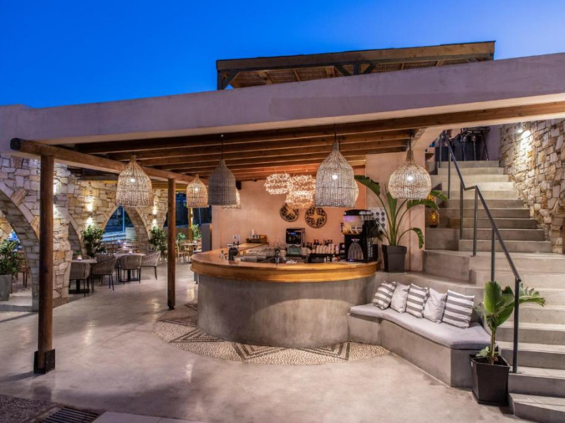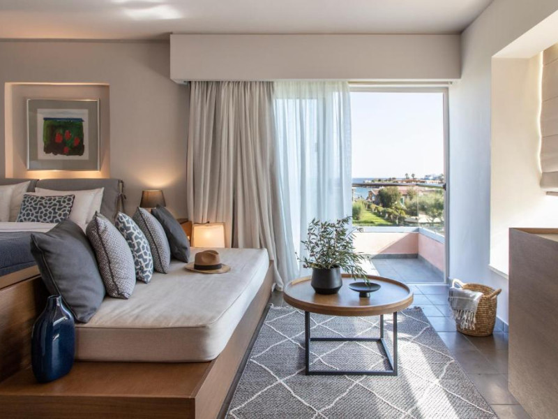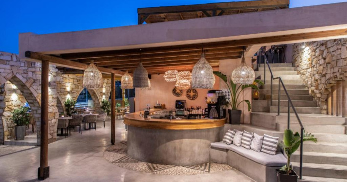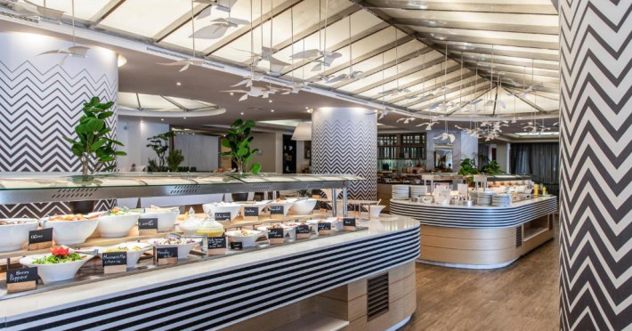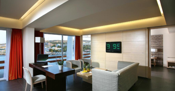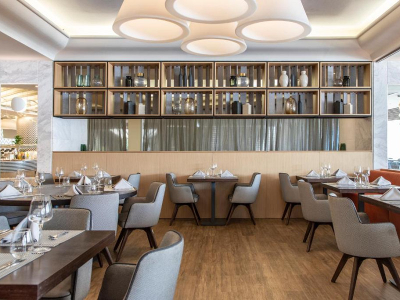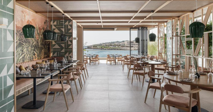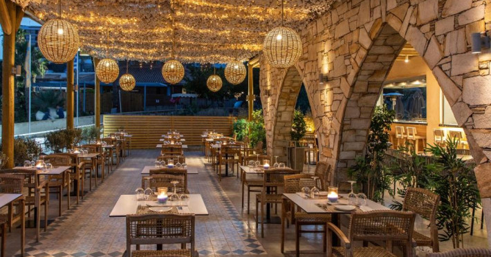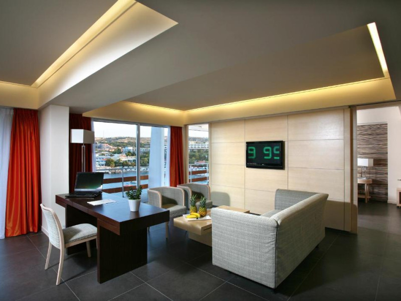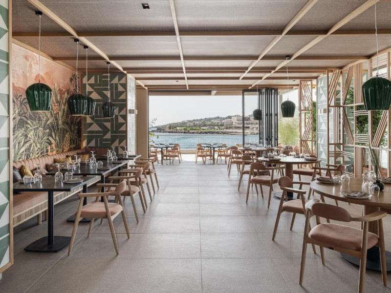 Oaspeții pot savura preparate din bucătăria internațională la restaurantul à la carte cu vedere la mare sau mancăruri grecești la taverna Dikti de pe malul mării. Hotelul pune la dispoziție in total 8 restaurante à la carte, pentru a satisface toate gusturile. Oaspeții trebuie să respecte un cod vestimentar la cină. Băuturile sunt servite la barul elegant cu șampanie și la diversele baruri de la piscină.