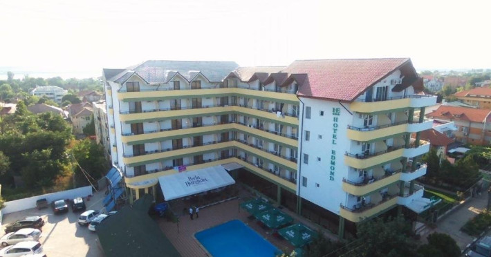 Localizare: Este localizat pe faleza, la 50 m de plaja.Descriere: Hotel Edmond pune la dispozitia turistilor 50 de camere duble si 10 apartamente, restaurant, bar, sala de conferinte, parcare, piscina.Turistii pot beneficia de peste 20 de tipuri de tratamente in Baza de Tratament Cosmos, pe care hotelurile Edmond si Cosmos o impart. Astfel, aici se pot face proceduri special concepute pentru afectiuni reumatice si de recuperare,infrumusetare si relaxare sau sportivi.Astfel, sunt disponibile urmatoarele proceduri: impachetari, masaj sau bai cu namol, reflexoterapie, electroterapie, terapie cu ultrasunet, magnetoterapie, laser terapie, unde scurte, criolipoliza, pressoterapie, cryo thermo, dus subacval, sauna cu ozon,