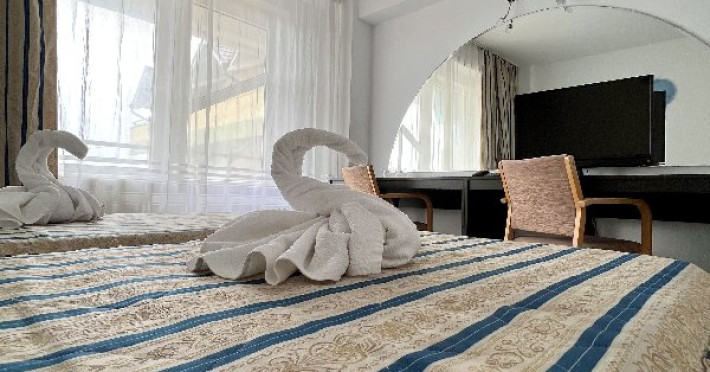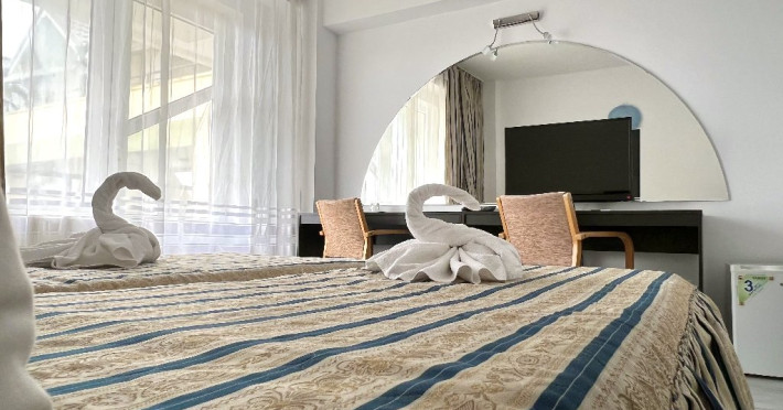 Camere: Camerele sunt spatioase si amenejate conform clasificarii de 3 stele, cu aer conditionat, minibar, televizor, internet.