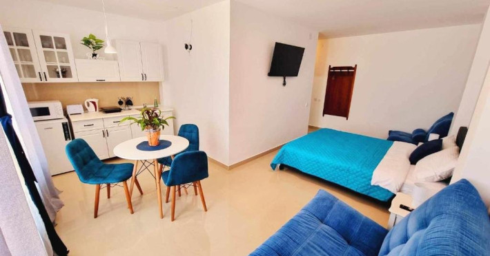 Studiouri 3 persoane cu suprafete intre 25-28 mp, sunt formate din pat matrimonial, si pat de o persoana sau canapea de o persoane, sau fotoliu extensibil, baie proprie cu dus, uscator de par, chicineta complet utilata, cuptor cu microunde, prajitor de paine, cana fierbator apa.