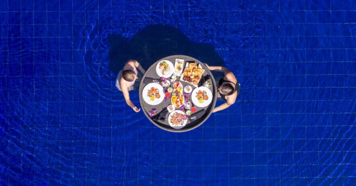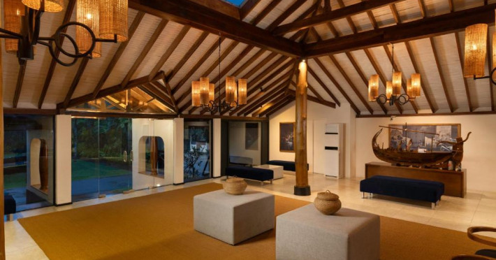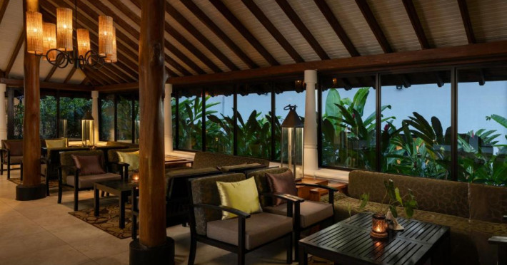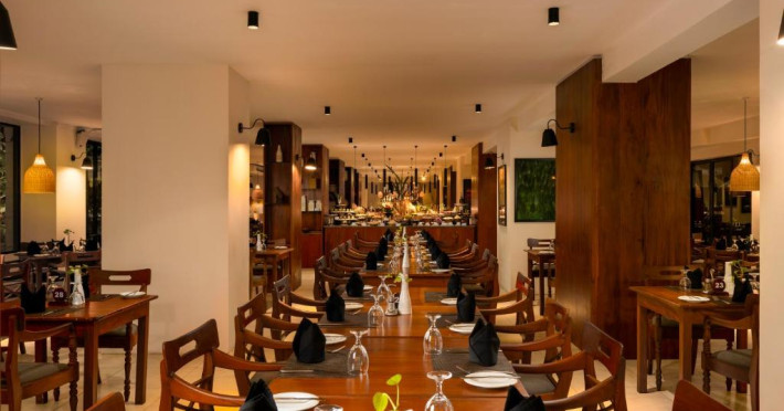 Restaurantul principal servește preparate din bucătăria internațională și specialități locale din fructe de mare proaspete. Piscina infinity oferă priveliști incredibile spre ocean, iar centrul spa propune tratamente ayurvedice autentice.
