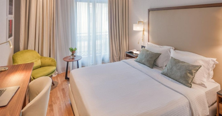 Hotelul are 130 de camere, 3 Junior Suites, 3 Suites si 2 Executive Suites, toate intr-un elegant stil neoclassic cu materiale si mobilier de lux. Toate camerele Superior si Executive, in stil neoclassic, decorate cu gust, au vedere spre Piata Aristotelous si spre mare. Un etaj pentru non-fumatori este disponibil. Hotelul are de asemenea un centru de fitness cu piscina interioara, baie de aburi, sauna, jaccuzzi. Personalul cu experienta ofera o larga paleta de servicii ca masaj, manichiura, pedichiura si ingrijirea fetei. Hotelul mai are si facilitati pentru conferinte si diverse evenimente, precum si restaurante si baruri.Datorita dinamicitatii domeniului disponibilitatea ofertelor se modifica de la un moment la altul. De aceea ofertele sunt valabile in limita locurilor disponibile. Agentia nu este responsabila pentru eventualele neconcordante care pot aparea intre informatiile privind tarifele si alte detalii din site si informatiile primite in agentie. In aceste cazuri vor avea prioritate, intotdeauna, informatiile primite in agentie.