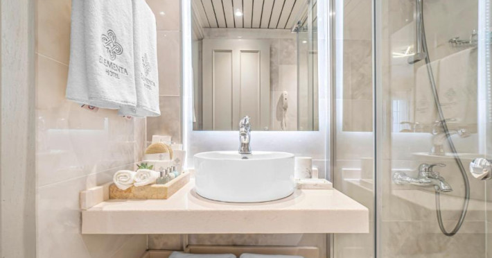 Fiecare cameră dispune de mașină pentru preparare cafea sau ceai, fierbător și minibar. Unele camere au balcon cu vedere la grădină sau la piscină. Camerele de la Elementa Hotel au în dotare aer condiționat și Tv. În camere există baie cu duș ce are în dotare foehn și articole de toaletă gratuite. Oaspeții au acces gratuit la serviciul Wi-fi în camere.
