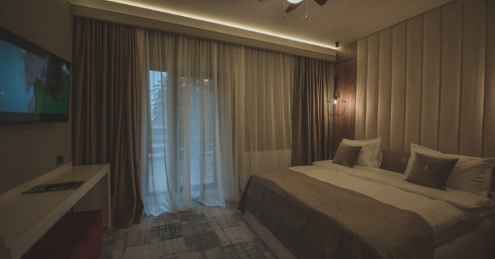 Apartament Deluxe este compus dintr-un dormitor cu pat matrimonial + 1 dormitor cu pat single, si este dotat cu balcon, TV LCD, pardoseala cu mocheta, baie proprie cu dus, uscator de par, halat, papuci si consumabile, seif si telefon. Accesul in junior suite se face pe baza de card.