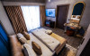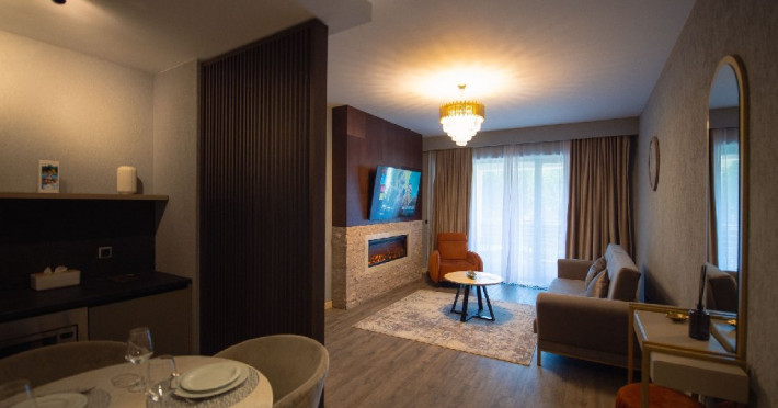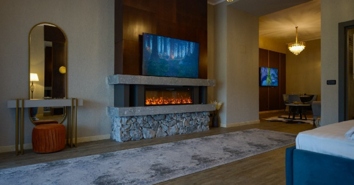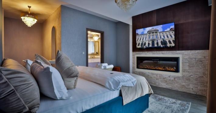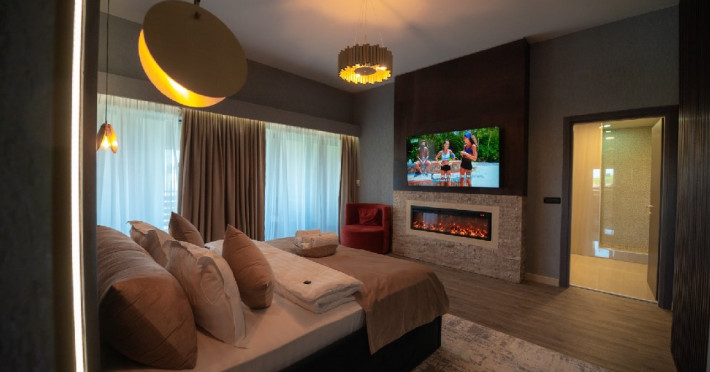 Deluxe Junior Suite - open space, pat matrimonial, canapea extensibila, semineu, balcon sau terasa. 3 adulti sau 2 adulti si 2 copii.