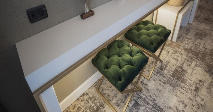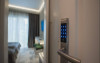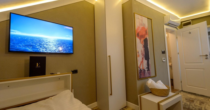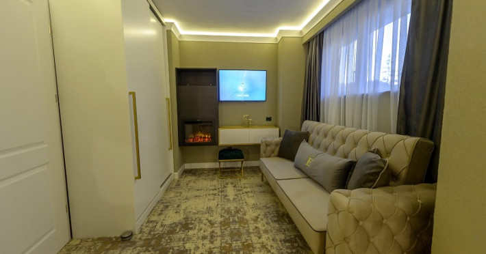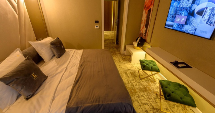 Apartamentele sunt dotate cu dormitor cu pat matrimonial si living cu canapea extensibila, minibar, aer conditionat, TV UHD Smart, telefon, seif, fierbator de apa, baie cu uscator de par, halat, papuci si consumabile. Accesul se face pe baza de cartela.