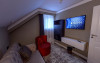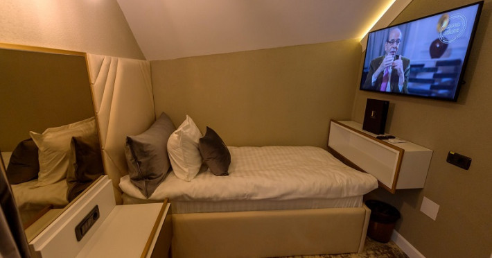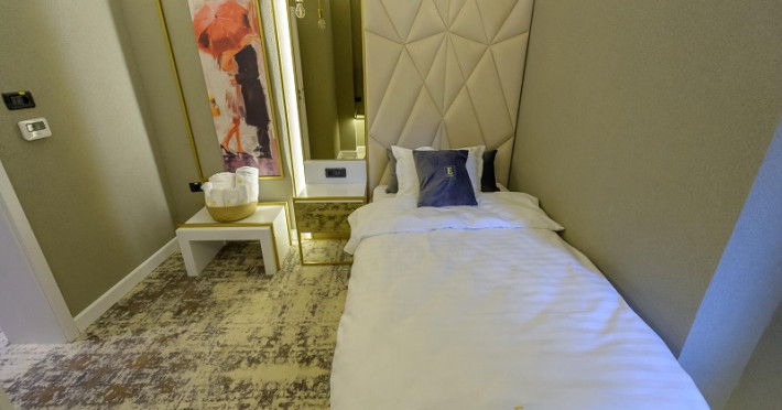Camera single este dotata cu pat pentru 1 persoana, aer conditionat, TV UHD Smart, minibar, seif, baie proprie cu dus, uscator de par, halat, papuci si consumabile. Accesul in camera se face pe baza de card.