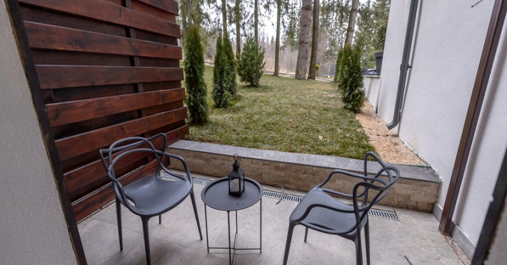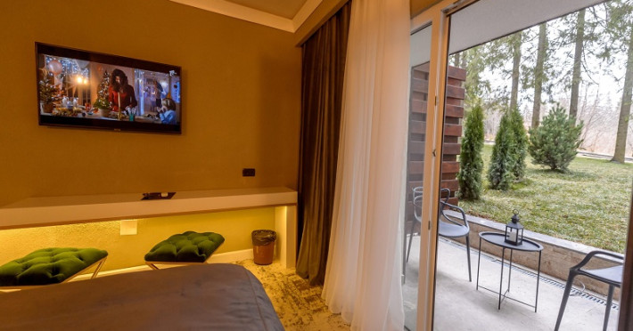 Camera dubla garden este dotata cu un pat matrimonial, aer conditionat, TV UHD Smart, minibar, telefon, seif, terasa cu acces la gradina, Fierbator de apa, baie cu uscator de par, papuci, halate si consumabile. Accesul se face pe baza de card.