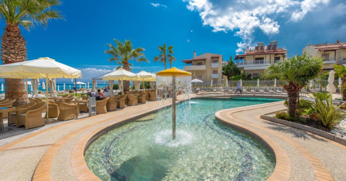Elinotel Apolamare, este un hotel de 5 stele, pozitionat pe plaja. În satul Hanioti, oaspeţii pot găsi mai multe baruri, taverne şi restaurante. Accesul WiFi este disponibil în zonele publice, iar oaspeții pot parca gratuit într-o locație din apropiere.