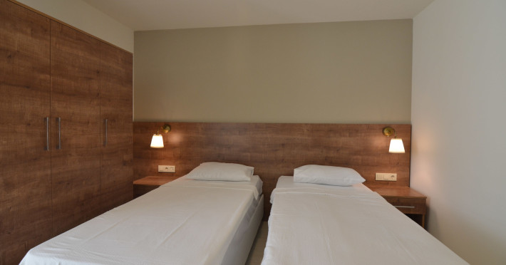 În camere există o zonă de living și o baie; aparatul de aer condiționat creează o atmosferă plăcută. În majoritatea spațiilor de cazare clienții beneficiază de vedere spre mare de pe balcon sau de pe terasă. Camerele dispun de un pat dublu și de o canapea. Opțional pot fi rezervate dormitoare separate. De asemenea, pot fi puse la dispoziție pătuțuri pentru bebeluși și paturi suplimentare. De asemenea, un seif și un minibar sunt disponibile contra cost. Pentru a înlesni aprovizionarea ocazională prin mijloace proprii, în spațiile de cazare există un frigider și un aparat pentru cafea/ceai. Telefonul, un televizor cu ecran plat cu canale prin satelit și WiFi-ul oferă un concediu confortabil. În băi se găsește un uscător de păr. Pentru familiile cu copii stau la dispoziție camere de familie.