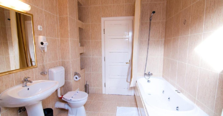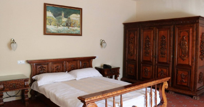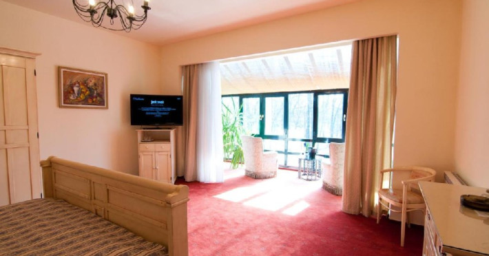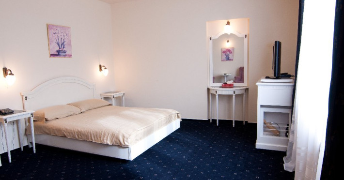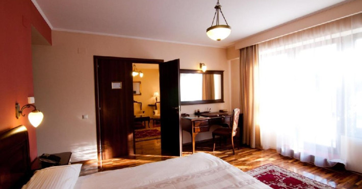 Camera dubla, suita 4* - este mai spatioasa, pat matrimonial de 1,90 metri, seif, TV, aer conditionat, telefon, frigider cu minibar, baie cu dus si uscator de par.