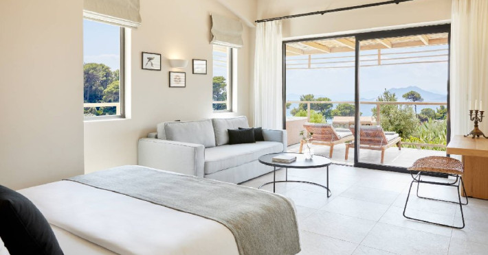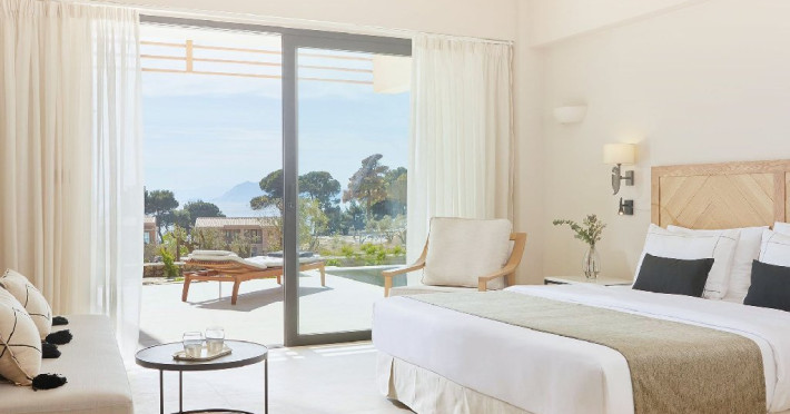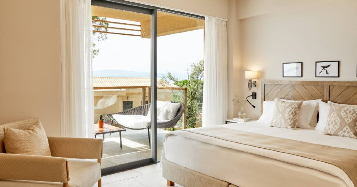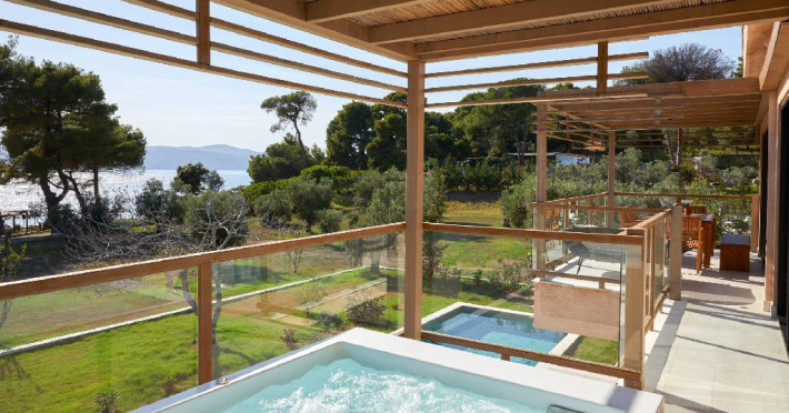Junior Suite Hot Tub: camerele sunt situate la etajul superior si pot acomoda 2 adulti si 1 copil. Este alegerea perfecta pentru 2 adulti si 1 copil care cauta o cazare unica si luxoasa, amplasata in natura. Cada cu hidromasaj si terasa mare dotata cu 2 sezlonguri, cu vedere catre Marea Egee, sporesc sentimentul de relaxare.