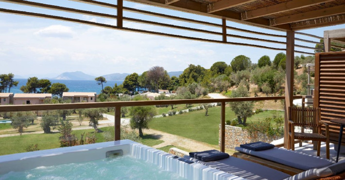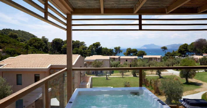 Junior Suite Hot Tub: camerele sunt situate la etajul superior si pot acomoda 2 adulti si 1 copil. Este alegerea perfecta pentru 2 adulti si 1 copil care cauta o cazare unica si luxoasa, amplasata in natura. Cada cu hidromasaj si terasa mare dotata cu 2 sezlonguri, cu vedere catre Marea Egee, sporesc sentimentul de relaxare.