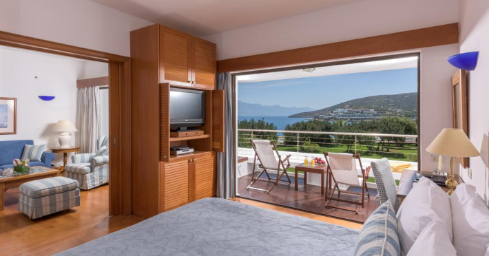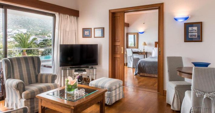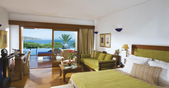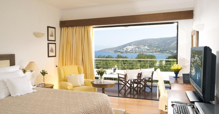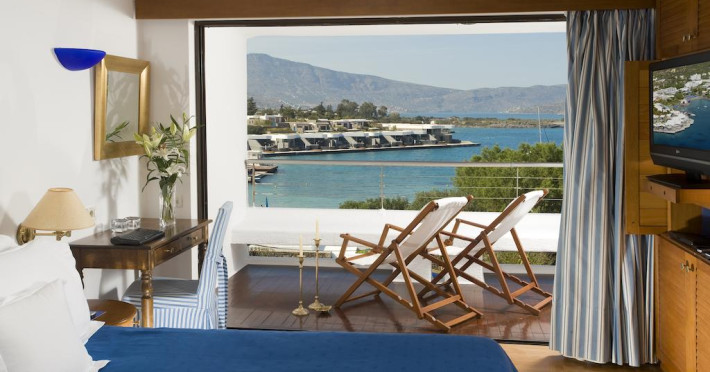 Sunt disponibile 219 camere. Unele camere au balcon cu vedere la mare sau la grădină. Camerele luminoase de la Elounda Beach sunt dotate cu parchet, aer condiționat, Tv cu canale prin satelit și seif. Fiecare cameră dispune de minibar. Oaspeții pot solicita serviciul de room service pentru a servi masa sau diverse băuturi. În camere există baie cu cadă sau duș ce are în dotare foehn și articole de toaletă gratuite. Oaspeții au acces gratuit la serviciul Wi-fi în camere. Curățenia in cameră se face zilnic. Anumite camere au cadă cu hidromasaj care asigură un plus de confort și răsfăț. Proprietatea oferă camere pentru familie cu o suprafață mai mare și un număr mai mare de paturi față de cele standard. Se pot rezerva de asemenea camere pentru nefumători.