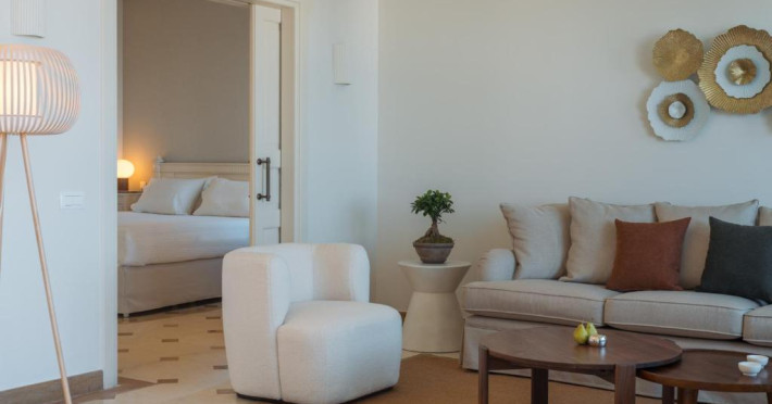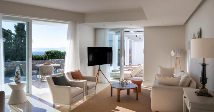 Fiecare suită elegantă are o bucătărie complet utilată cu cuptor cu microunde și o baie din marmură cu hidromasaj. Toate au acces la piscina comună. Elounda Gulf Villas by Sandglass oferă camere de zi spațioase și căzi de baie.