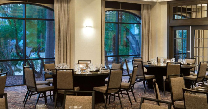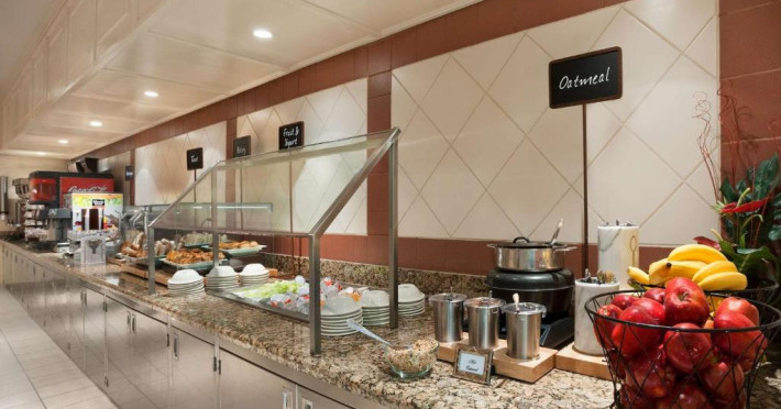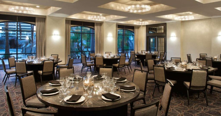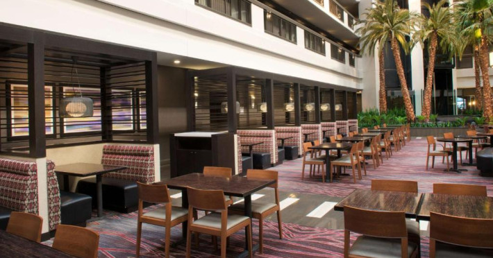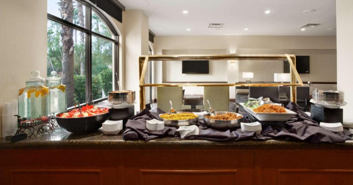 Hotelul Embassy Las Vegas oferă zilnic un mic dejun complet gătit la comandă și recepție de seară. De asemenea, oaspeții pot lua masa la Three Palms Café, care servește preparate din bucătăria continentală. De asemenea, sunt oferite gustări de seară.